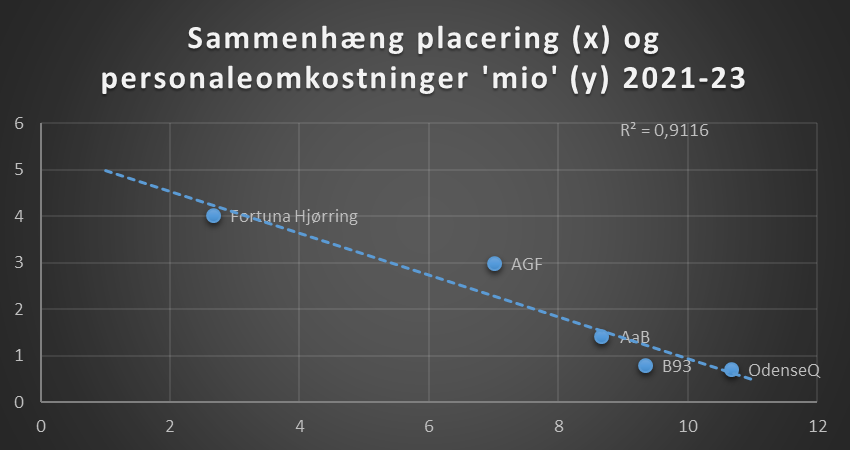 Ses der på resultaterne fra 2019-2023, så er sammenhængen mellem gennemsnitlige placering og gennemsnitlige personaleomkostninger på 91%