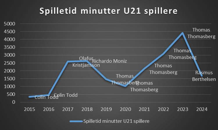 Jo mere spilletid, jo større mulighed for spillersalg. Her er medtaget hvor meget spilletid alle U21 spillere eller yngre har haft, samt hvem der var træner.