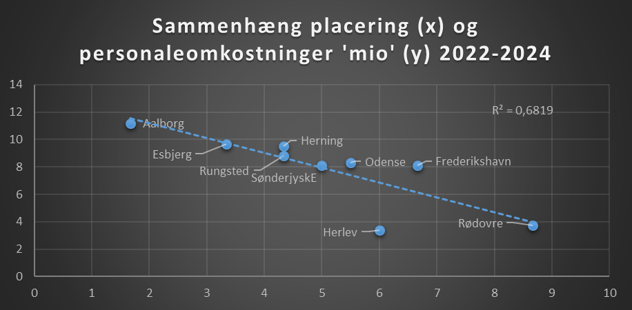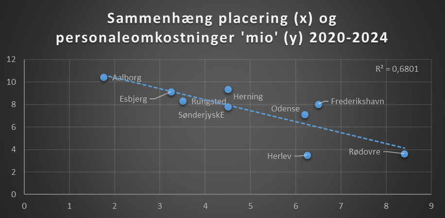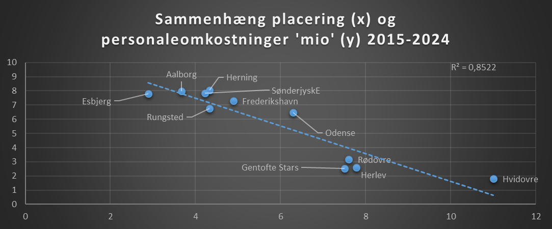 Ses der over de seneste 10 sæsoner, er sammenhængen ret høj nemlig 85%. De klubber der ligger over den stiplede linje præsterer dårligere end hvad deres økonomi tilsiger, og omvendt de klubber der ligger under, de gør det bedre.