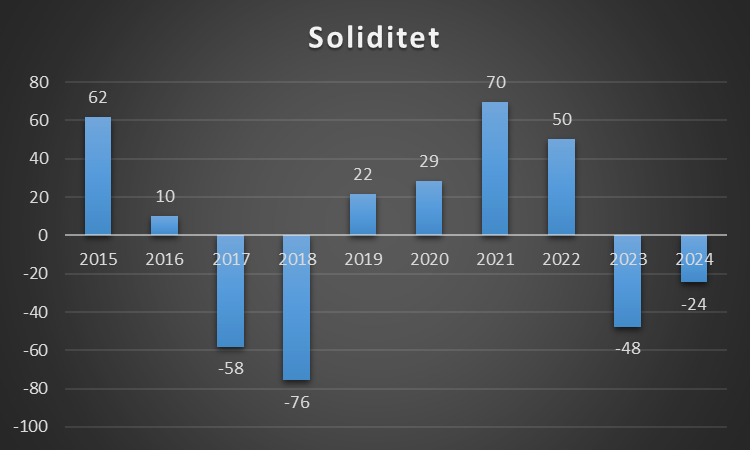 | Rød | Soliditet på -24 Gælden udgør 124% af aktiverne Negativ egenkapital på 3,7 mio |
