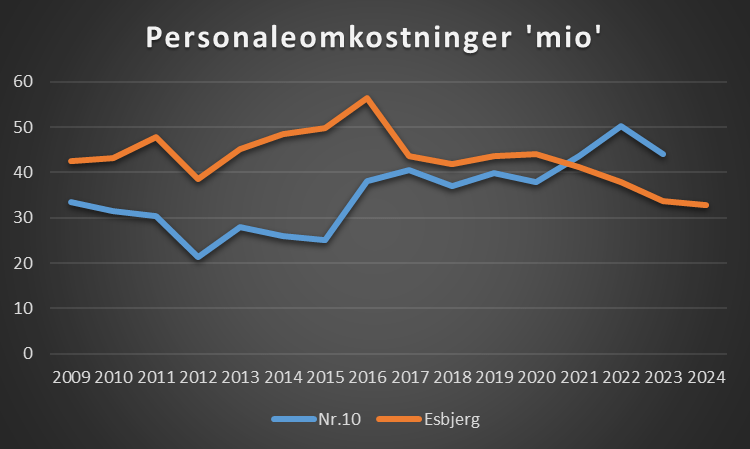 Ses der på udviklingen siden 2009, så har Esbjerg ligget over top 10, men med de nye ejere der kom til i 2021, så blev klubben hægtet bagom. I 2030 skal klubben der er rangeret som 10.største målt på personaleomkostninger, forventes at ligge på 55-60 mio.