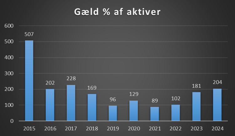 | Rød | Soliditet på -104 Gælden udgør 204% af aktiverne Egenkapital er negativ på 19,9 mio |