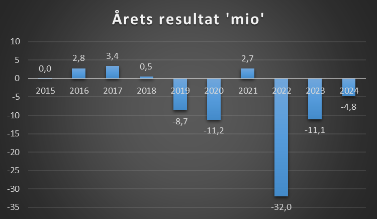 En væsentlig del af denne proces har været en reduktion i personaleomkostningerne, som er nedbragt fra 53 mio. kr. til 41 mio. kr. Denne tilpasning har bidraget væsentligt til en forbedring af årets resultat, hvor underskuddet er reduceret til 4,7 mio. kr. – et markant fremskridt sammenlignet med underskuddene på hhv. 11 mio. og 32 mio. kr. de to foregående regnskabsår.