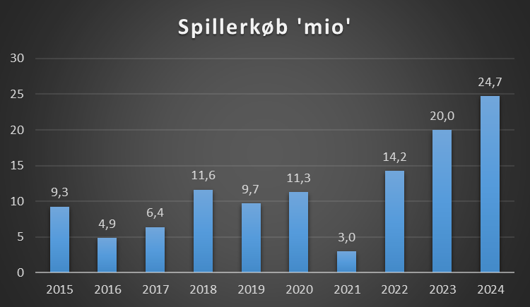 På investeringer i spillertruppen har klubben sat rekord. Der er brugt 24,7 millioner kroner på spillerkøb det seneste år, og over de seneste tre regnskaber er der samlet investeret 59 millioner kroner – samme beløb som klubben brugte på transfers i hele perioden 2012-2021. Samtidig er der stadig samlet overskud på transfersiden, hvilket vidner om en god balance mellem investering og afkast.