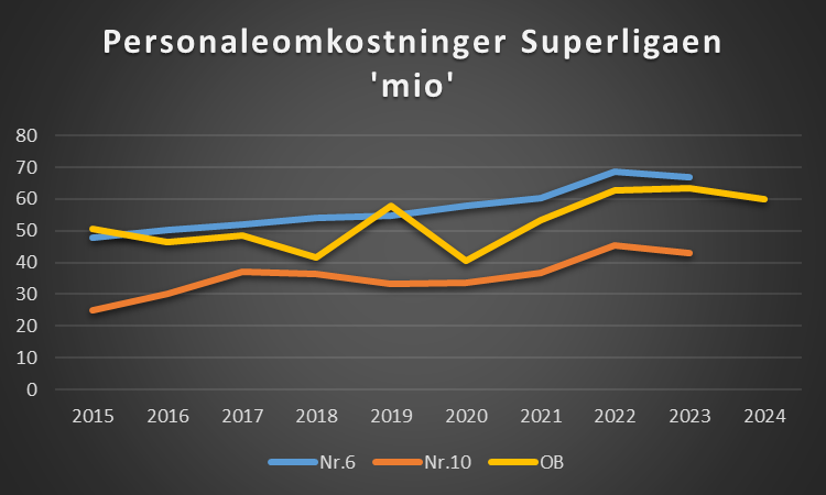 Herunder vises udviklingen for den klub der er rangeret med det 6.største lønbudget og 10.største lønbudget i Superligaen