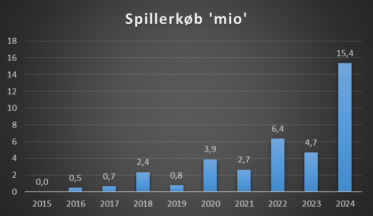 Men det er også tydeligt, at uden de store salg ville klubben have underskud. Det understreger, hvor central transferstrategien er blevet for klubbens økonomi. I det seneste regnskab ses samtidig det største spillerindkøb i klubbens historie – 15 mio. kr, mod kun 22 mio. samlet over de foregående ti år. Er det et strategisk skifte?