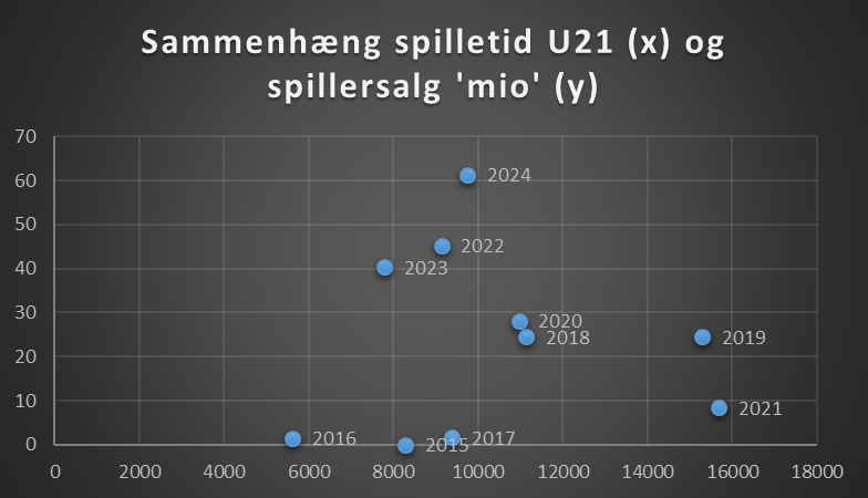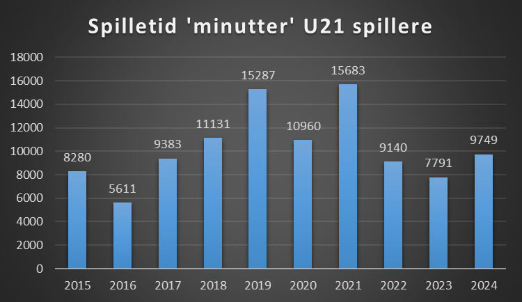 Jo mere spilletid, jo større mulighed for spillersalg. Her er medtaget hvor meget spilletid alle U21 spillere eller yngre har haft, og i alle turneringer.