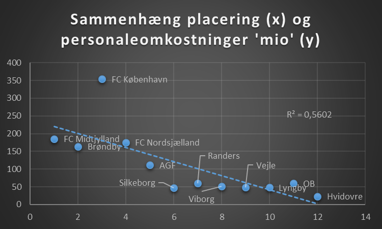 FC København ligger markant over den stiplede linje, men da klubben i den grad satser internationalt, så er det størrelsen på budgettet der skal til. Men med afsæt i tendenslinjen, så kan et dansk mesterskab hentes for 200 mio.