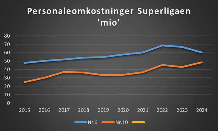 Det er interessant at se på hvad skal der til for at have det 6.største budget og det 10.største over tid. Dette giver en ide om hvor Superligaen bevæger sig økonomisk.