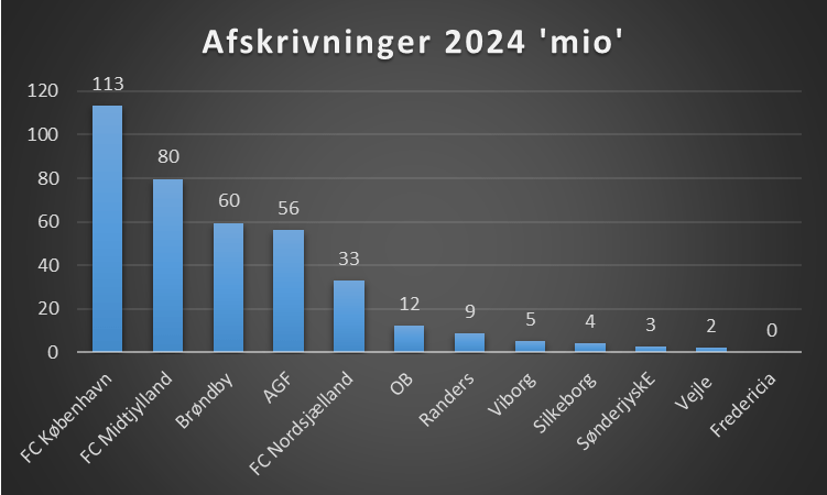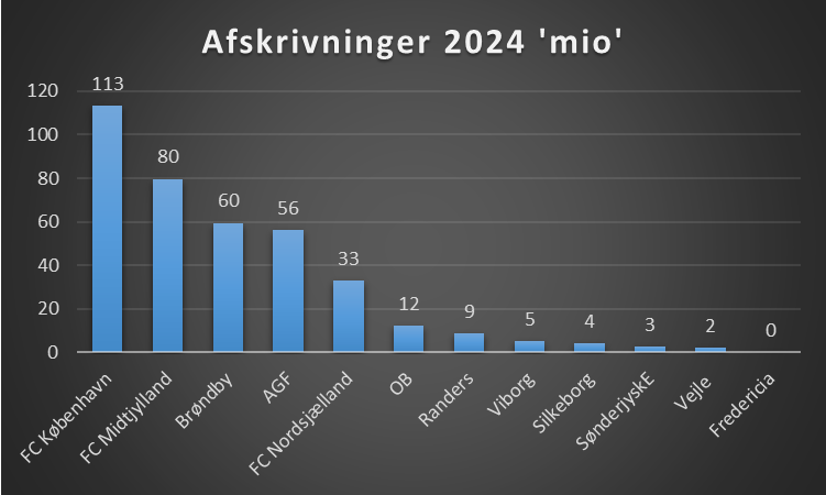 Kommer en spiller til en klub på en 4 årig kontrakt og er købt for 20 mio, så afskrives spilleren med 5 mio af året. De samlede afskrivninger er således hvad spillertruppen afskrives med.