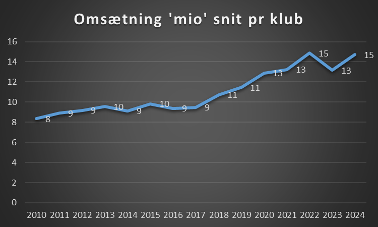 Da antallet af klubber har været lidt forskelligt, så skal der også ses på hvad er omsætningen i snit pr. klub