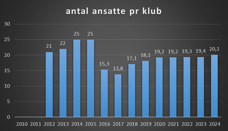 Ses der på antal ansatte pr klub, så er udviklingen således, her skal det bemærkes at i starten var det de store klubber der havde selskaber, og da flere klubber kom med, så faldt gennemsnit