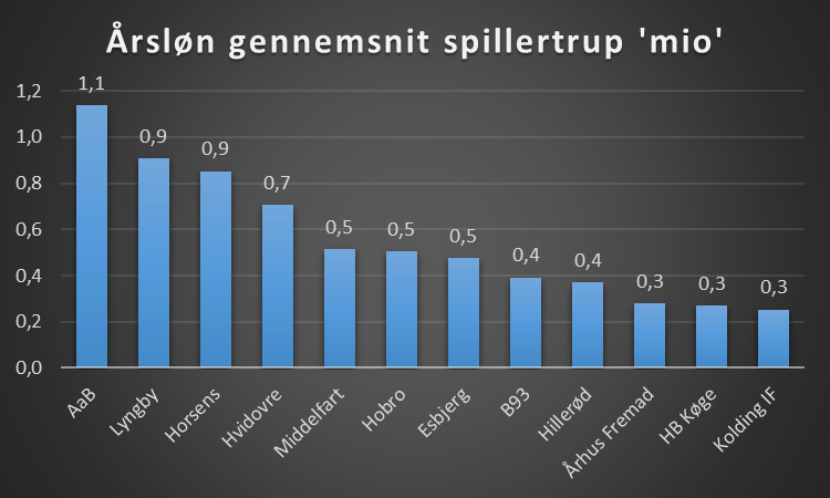 En af de mindst økonomisk stærke klubber, men med en forholdsvis høj gennemsnitsløn. Det kan tyde på få men dygtige spillere – et sats, som skal lykkes, hvis de vil undgå nedrykning. - Århus Fremad