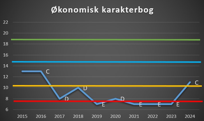 Får en klub karakteren E, betyder det at den har scoret lavest i alle 7 økonomiske parameter, det er særdeles bekymrende. Karakter A er det bedste.