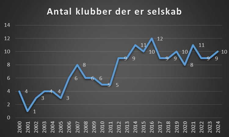 Et tydeligt tegn på denne udvikling er antallet af klubber i 2. division, der er organiseret som selskaber. I 2000 var der blot fire klubber, som havde valgt denne struktur, og det tal har i 2024 nået ti klubber. Det svarer til næsten alle klubber!