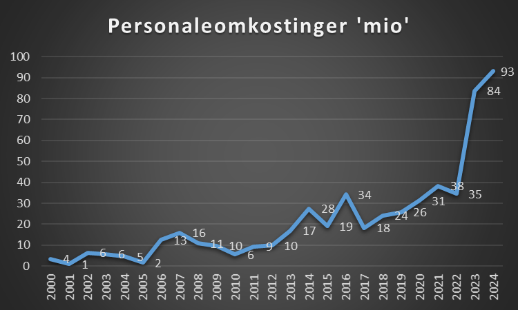 Særligt siden 2013 er udviklingen accelereret. I 2013 lå personaleomkostningerne på ca. 17 mio. kroner, og i 2020 var det steget til 31 mio. kroner. Siden er det nærmest eksploderet: 2021 (38 mio.), 2022 (34 mio.), 2023 (83 mio.) og senest 2024 med hele 93 mio. kroner.