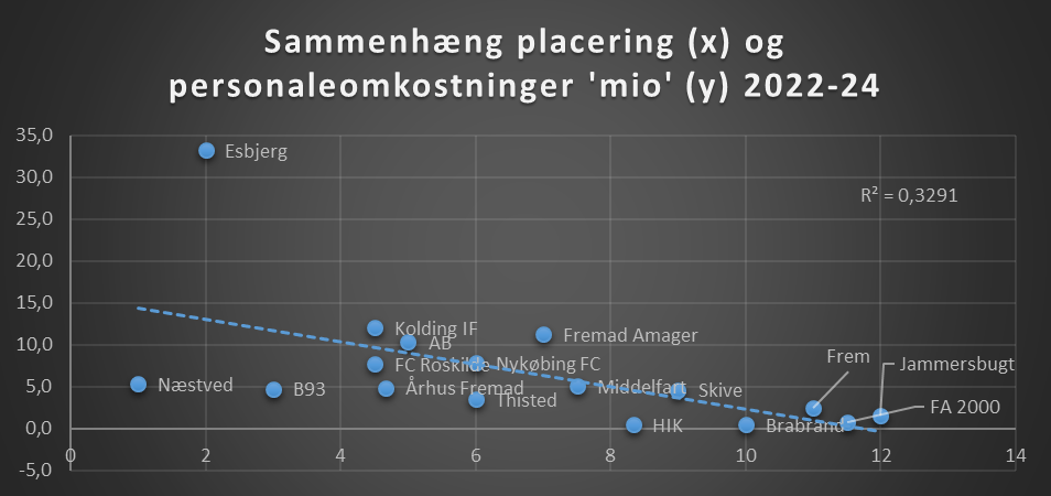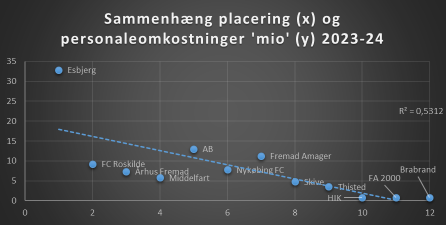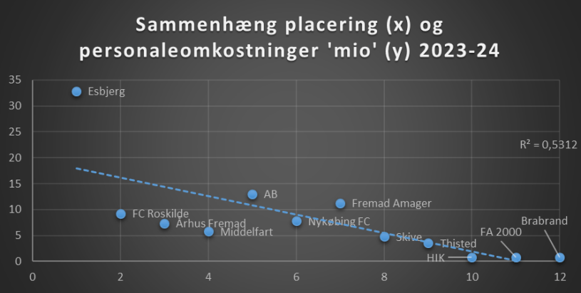 Når man regner sammenhængen mellem placering og personaleomkostninger i 2023/24-sæsonen, får man en korrelation på 53,8 %. Det betyder, at lidt over halvdelen af placeringen kan forklares med økonomien, men der er stadig plads til sportslig over- eller underpræstation.