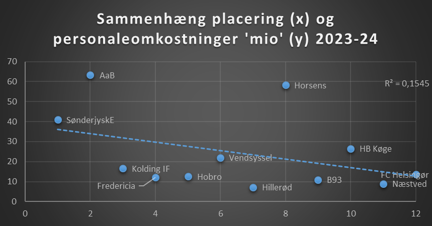 Her ser vi et mere klassisk billede, hvor klubber med høje personaleudgifter – som SønderjyskE, Vejle, Horsens og AaB – også gennemsnitligt ligger højt i tabellen. Samtidig er det værd at fremhæve klubber som Fredericia og Hvidovre, Kolding og Hillerød der med relativt små budgetter har leveret solidt over tid.