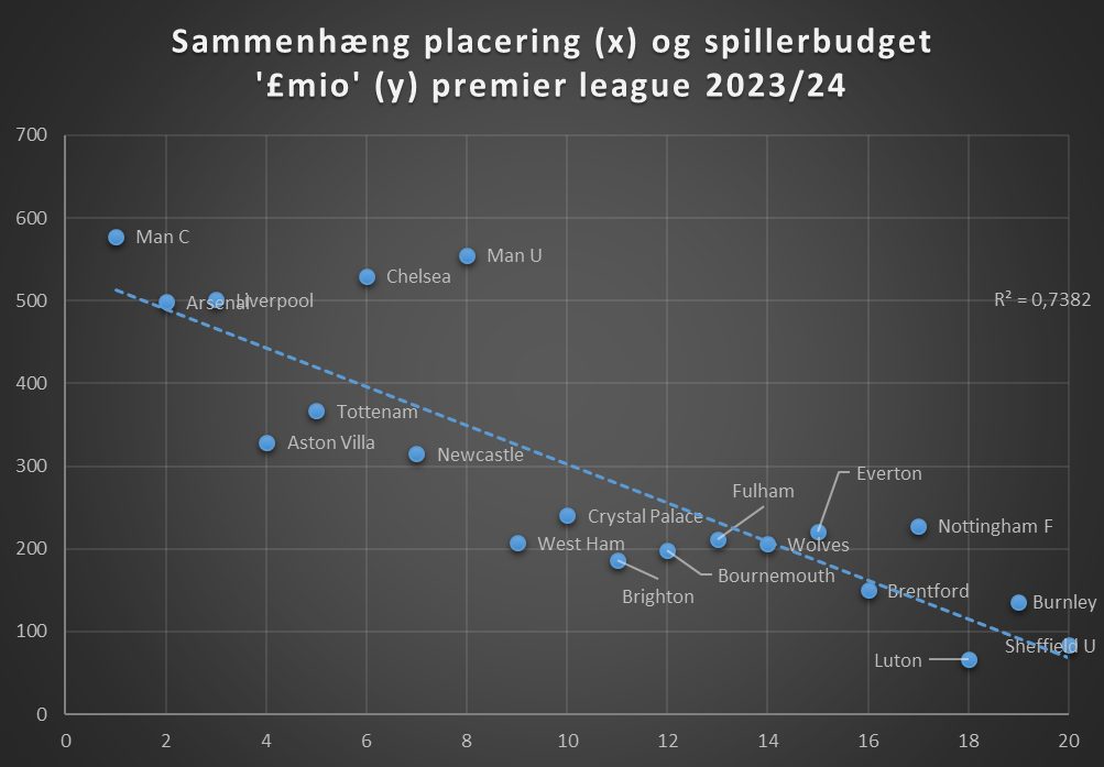 Hele 74 % af variationen i klubbernes placering kan forklares alene ud fra deres spillerbudget – altså summen af lønninger og afskrivninger på transferkøb.
