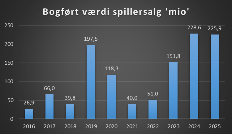 Klubben oplyser ikke spillersalg i regnskabet, men de oplyser hvad den bogførte værdi er på de spillere der har forladt klubben er, men bemærk det har INTET med det reelle spillersalg at gøre.