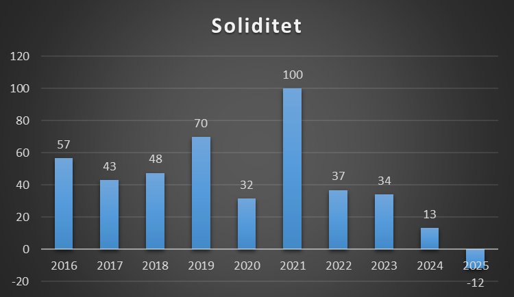 En soliditetsgrad på 0 er også sjældent godt, da klubben har finansieret alle sine aktiver med fremmed kapital. Det gør gør klubben meget skrøbelig overfor økonomisk modgang, da der ikke skal meget til, før de ikke kan betale sine økonomiske forpligtelser.