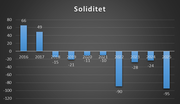 En soliditetsgrad på 0 er også sjældent godt, da klubben har finansieret alle sine aktiver med fremmed kapital. Det gør gør klubben meget skrøbelig overfor økonomisk modgang, da der ikke skal meget til, før de ikke kan betale sine økonomiske forpligtelser.