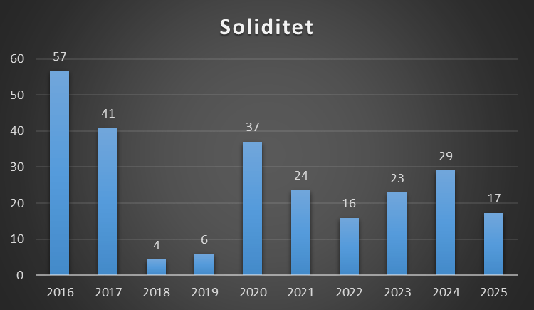 En soliditetsgrad på 0 er også sjældent godt, da klubben har finansieret alle sine aktiver med fremmed kapital. Det gør gør klubben meget skrøbelig overfor økonomisk modgang, da der ikke skal meget til, før de ikke kan betale sine økonomiske forpligtelser.
