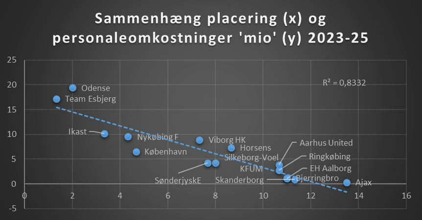 Set over de seneste tre regnskaber 2023-25, hvordan ligger klubberne så? Den stiplede blå linje viser tendensen, ligger en klub over, præsterer den dårligere end hvad økonomien tilsiger, og omvendt de klubber der ligger under, præsterer bedre.