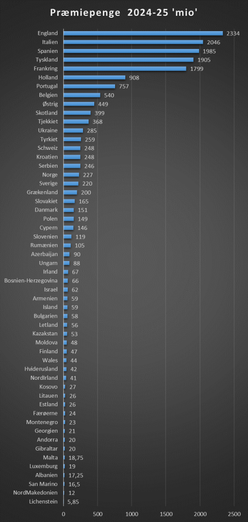 Når UEFA i sæsonen 2024-25 fordeler præmiepenge til klubberne i Champions League, Europa League og Conference League, er der tale om et massivt økonomisk maskineri. De samlede præmiepenge lander omkring 17,4 mia. kroner , og fordelingen viser tydeligt, at de fem store ligaer sidder tungt på værdien.