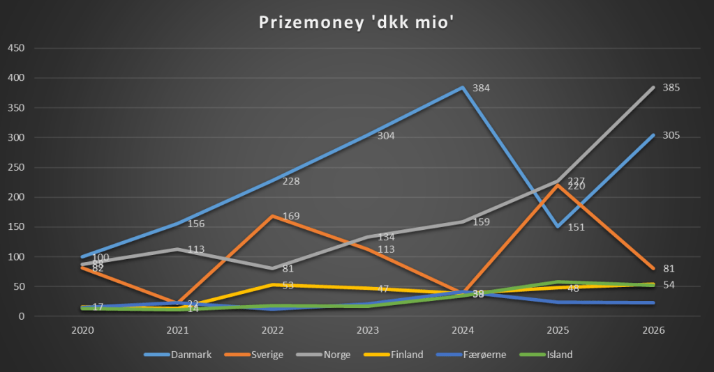 Norge er den mest markante udviklingshistorie i tallene. Fra 88 mio. DKK i 2020 til hele 385 mio. DKK i 2026 – og et gennemsnit på 170 mio. DKK, der placerer dem som klar nordisk toer. De sidste fire sæsoner er særlig interessante: 134 → 159 → 227 → 385. Det ligner ikke et tilfælde, men et mønster.