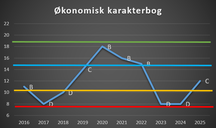 Får en klub karakteren E, betyder det at den har scoret lavest i alle 7 økonomiske parameter, det er særdeles bekymrende. Karakter A er det bedste.