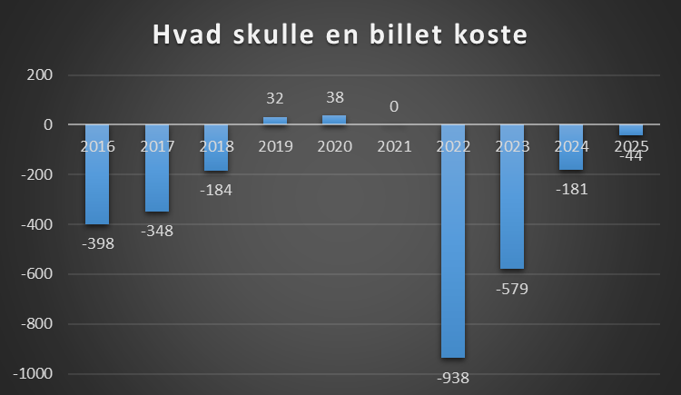 Hvad ville billetprisen være det enkelte år, hvis entre pris skulle dække underskud, samt hvad tjener klubben i snit pr tilskuer, ikke forstået som at det er på den enkelte tilskuer man tjener, men klubbens overskud holdt op mod antal tilskuere.