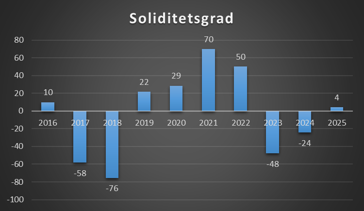 En soliditetsgrad på 0 er også sjældent godt, da klubben har finansieret alle sine aktiver med fremmed kapital. Det gør gør klubben meget skrøbelig overfor økonomisk modgang, da der ikke skal meget til, før de ikke kan betale sine økonomiske forpligtelser.