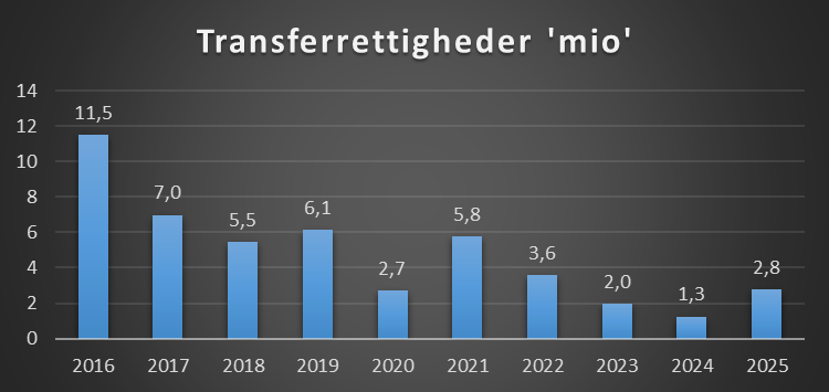 Bliver en spiller købt eller solgt for 18 mio på en treårig kontrakt, så kan det være en aftale hvor betalinger sker i rater, således at de 18 mio ikke optræder i regnskabet, men 6 mio spredt over 3 regnskaber. Nedenstående er således en oversigt over transferbeløb der kommer ind og ud det enkelte regnskab.