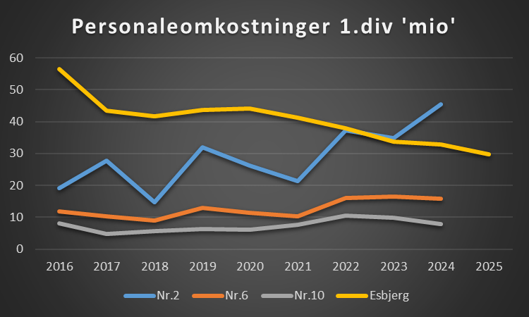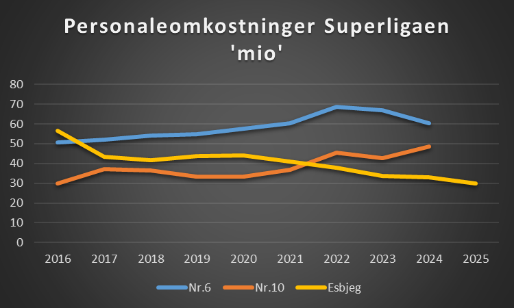 Skal Esbjerg begå sig i Superligaen, ja så er det samme billede. Klubben der undgår nedrykning skal ende som nummer 10, og udviklingen viser at skal du være nummer 10 økonomisk set, så hedder det 50 mio på personaleomkostninger, og gerne mere hvis du vil have luft til stregen. Så Esbjerg skal løfte sig markant.